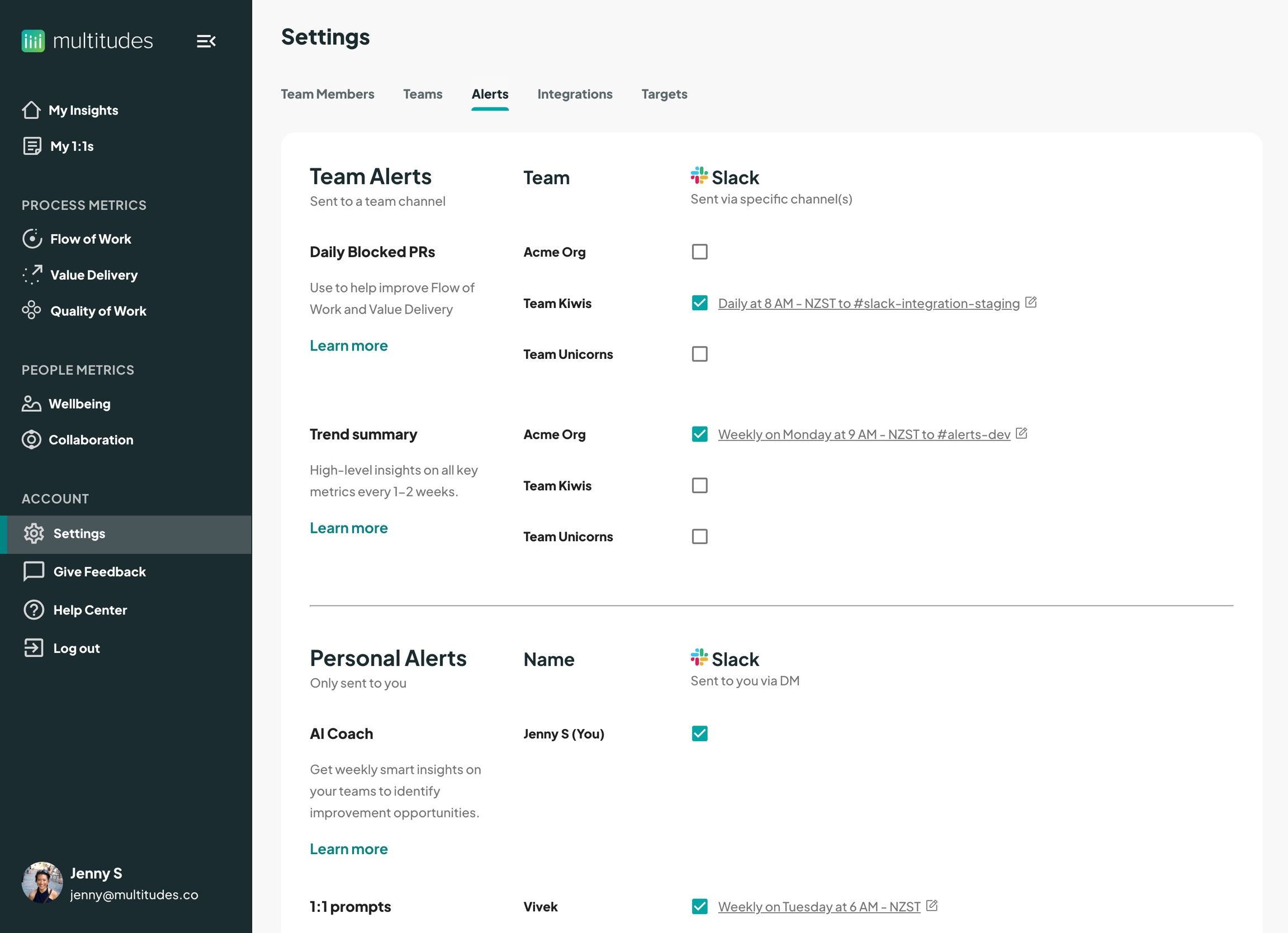 Set up and customize Slack and email notifications to receive timely insights about your team.