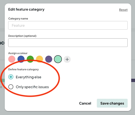 , by selecting the “Everything else” option when editing the Feature category (see image below; this is the default - since a lot of teams are using this chart to get a quick high level view of the two buckets, it’s easier to think of all work that’s not Maintenance as part of the Feature)Not counted at all, by selecting the “Only specific issues” option when editing the Feature category (see image below; this means some work will be completely excluded from the chart if it isn’t captured by the defined conditions)