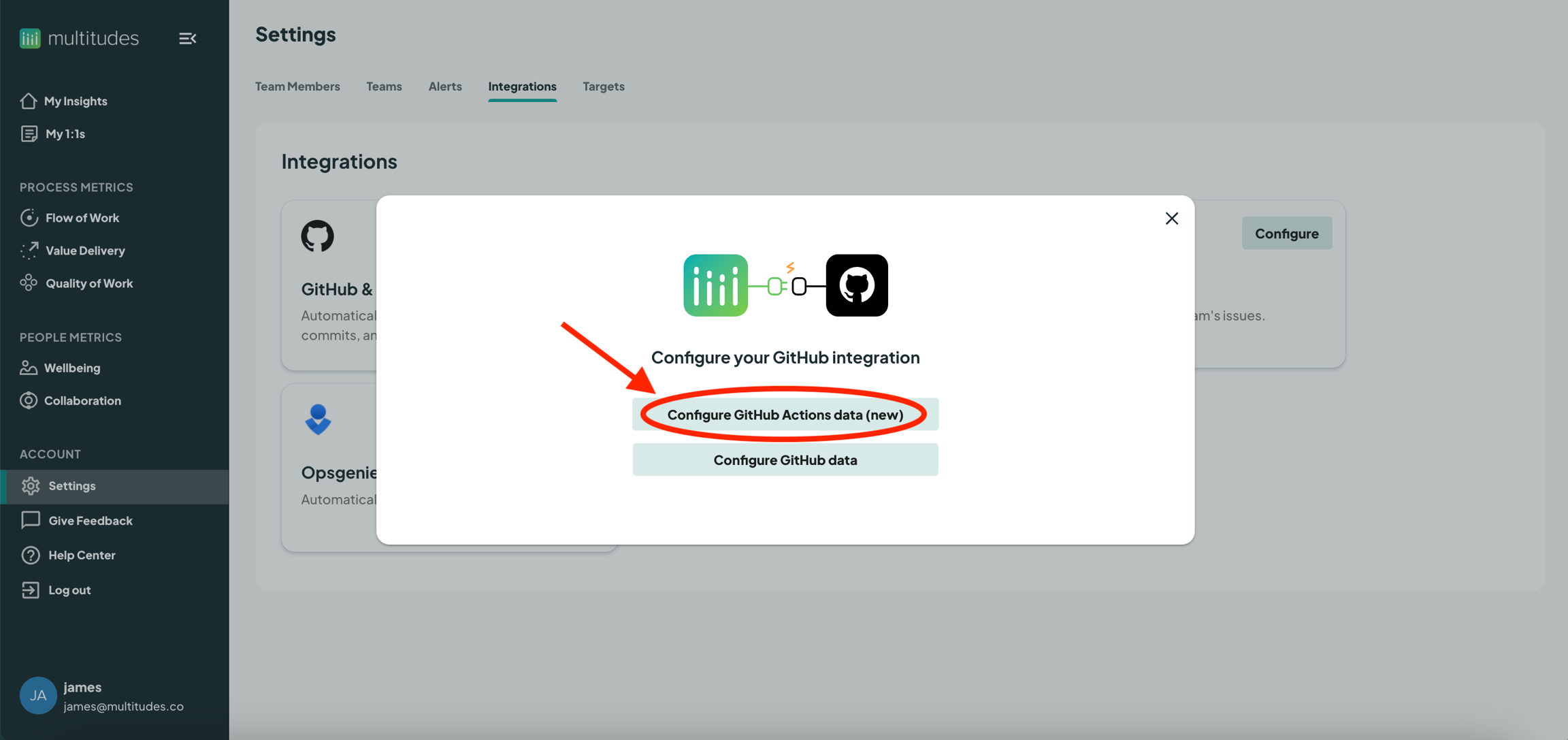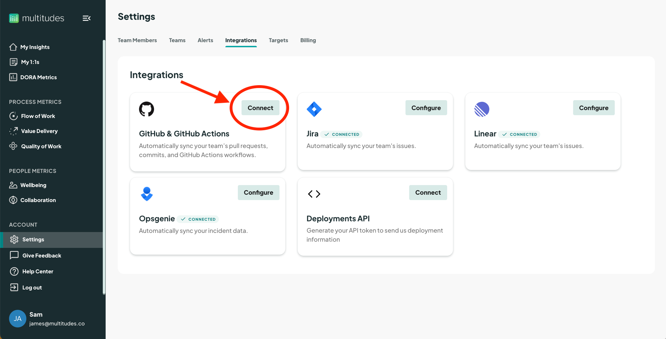 In the Multitudes app, go to Settings > Integrations and click on the Connect button in the Github and Github Actions card