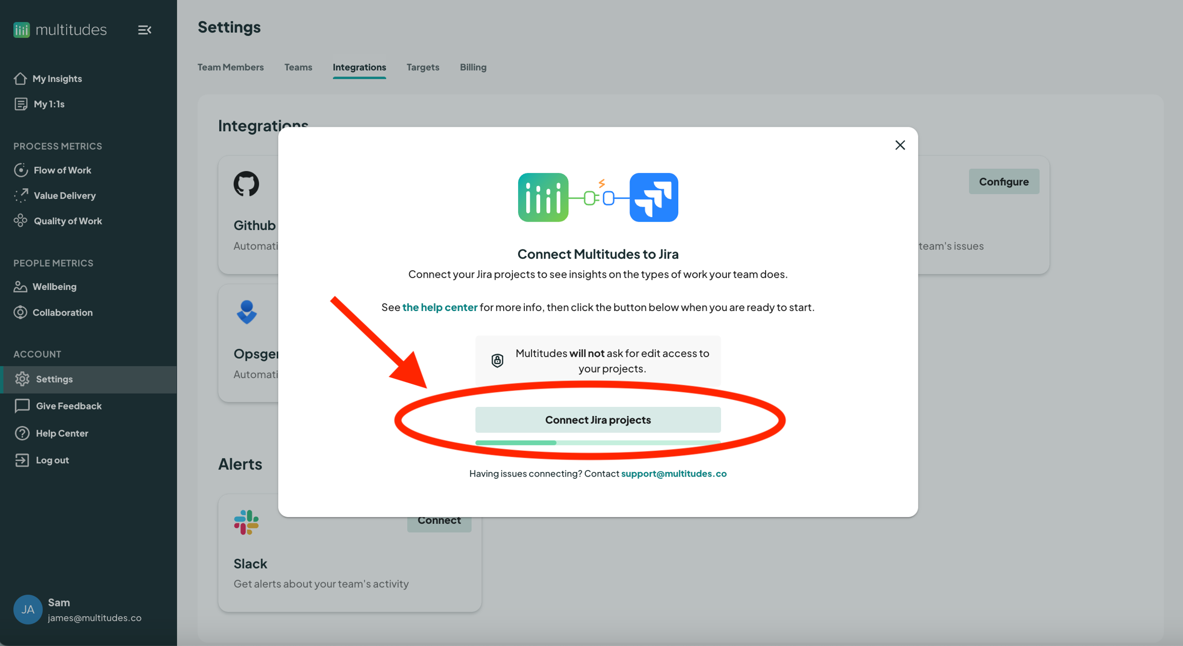 On the Multitudes app, go to the Integrations page (from the menu, find Account, click Settings, then click the Integrations tab across the top). Find the card that says Jira in the top Integrations section and click ‘Connect’ at top right.