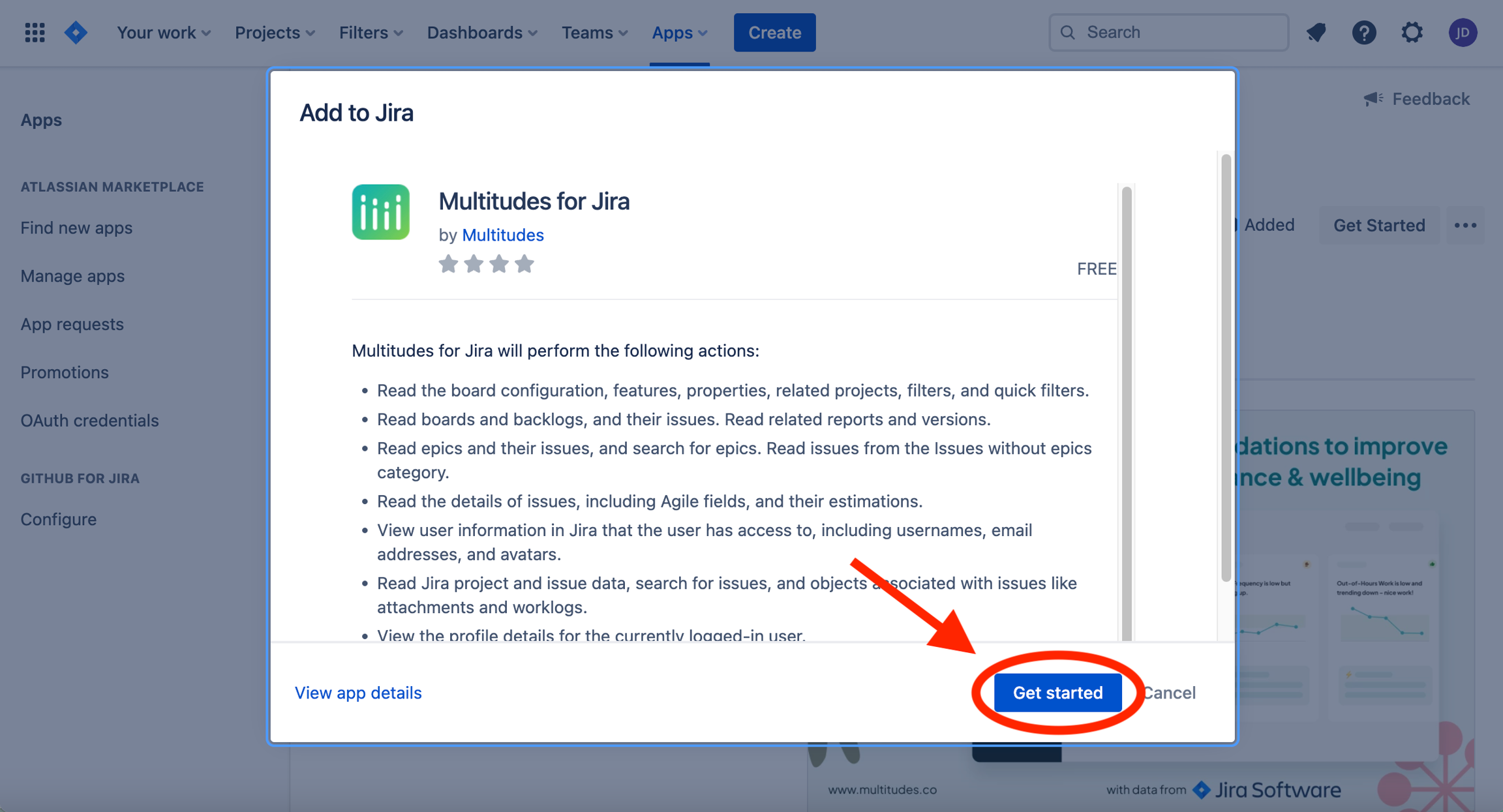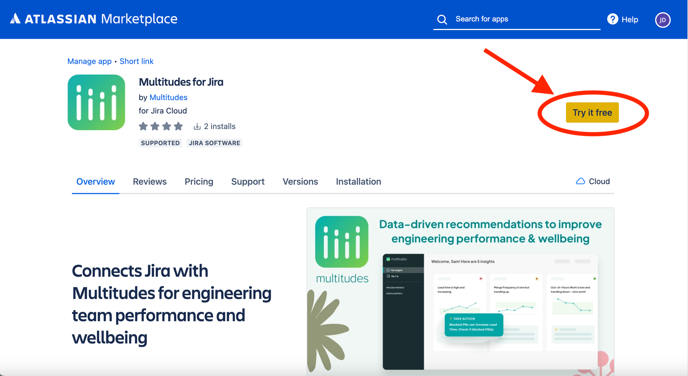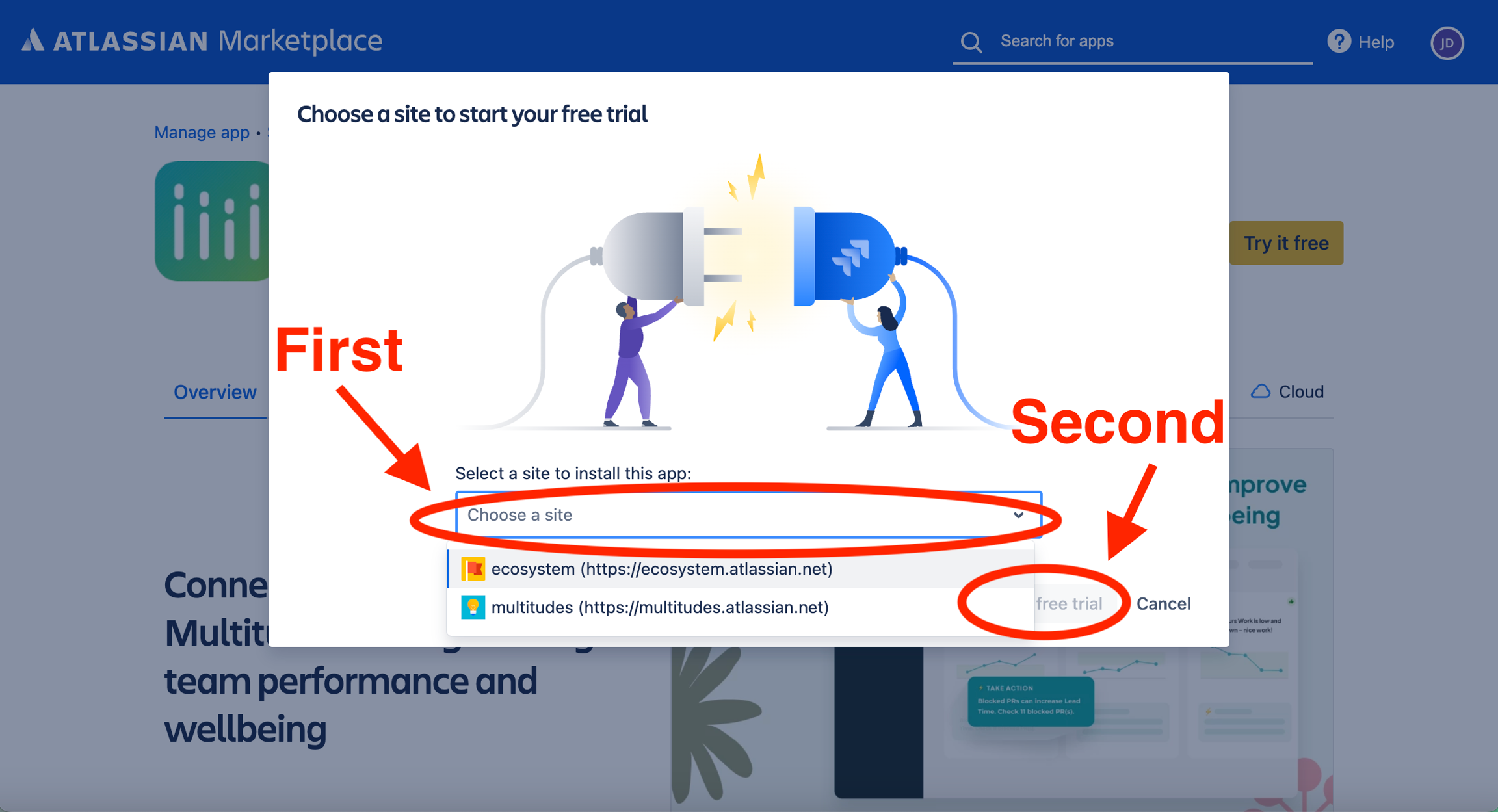 This opens a new page on Atlassian Marketplace, click ‘Try it free’