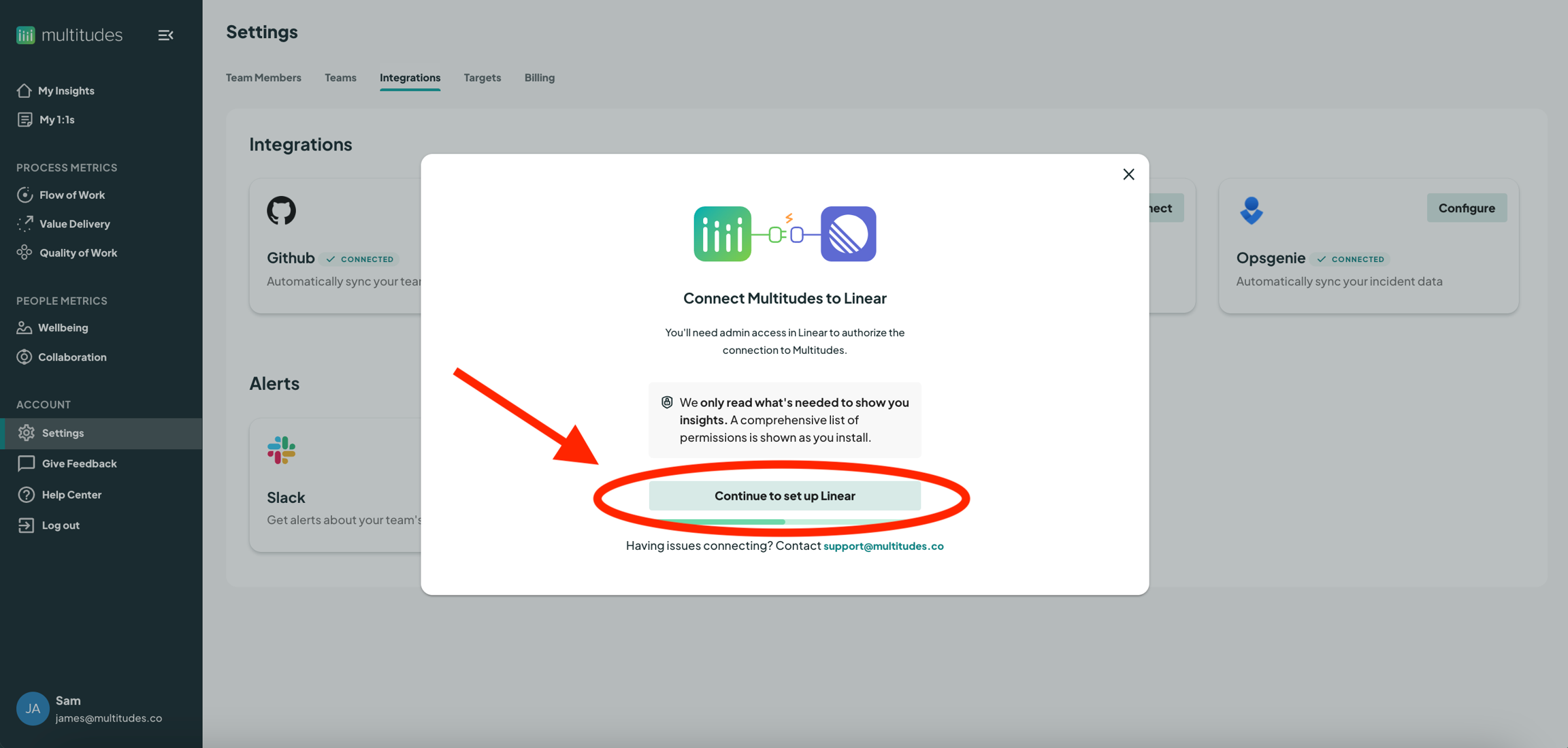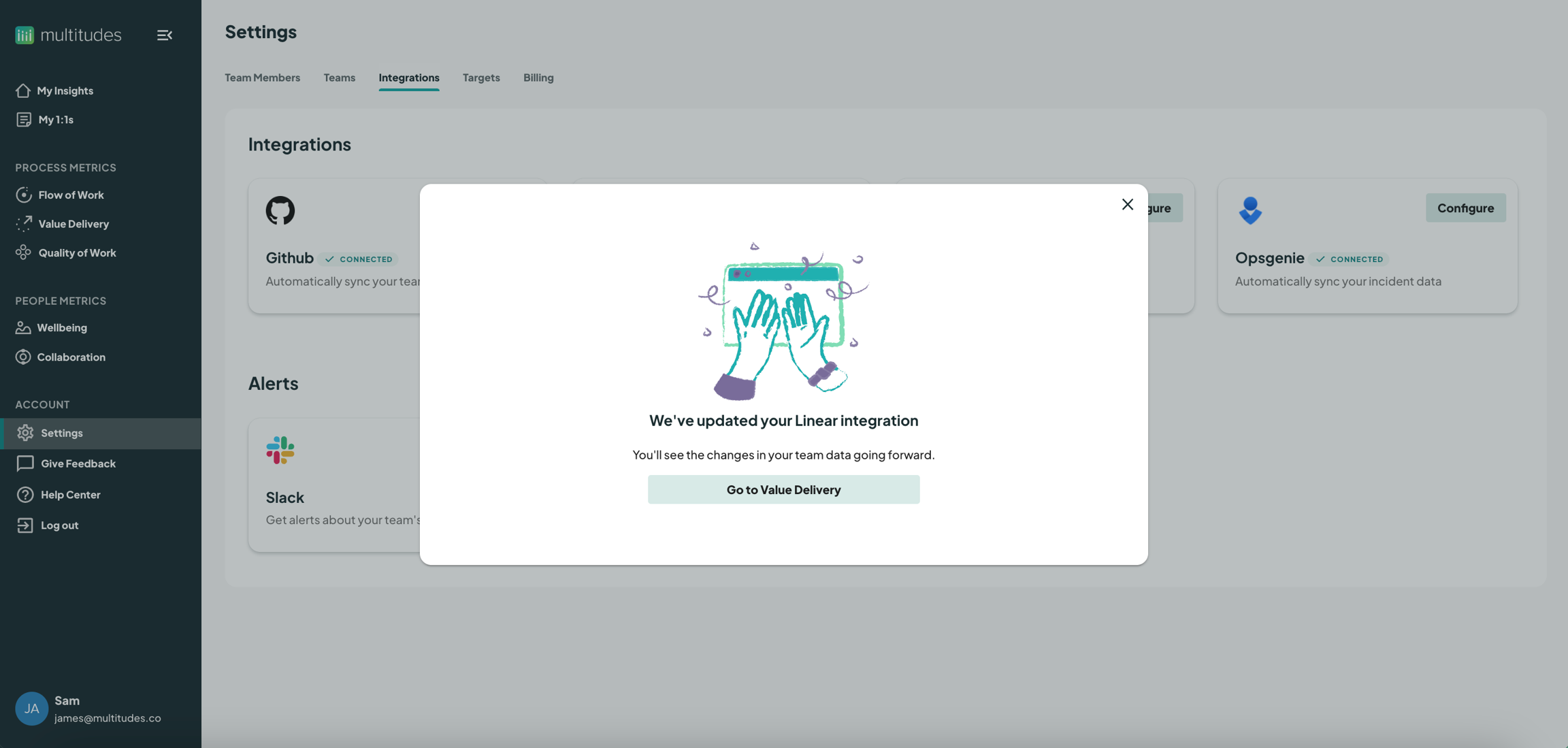 On the Multitudes app, go to the Integrations page (from the menu, find Account, click Settings, then click the Integrations tab across the top). Find the card that says Linear in the top Integrations section and click ‘Connect’ at top right.