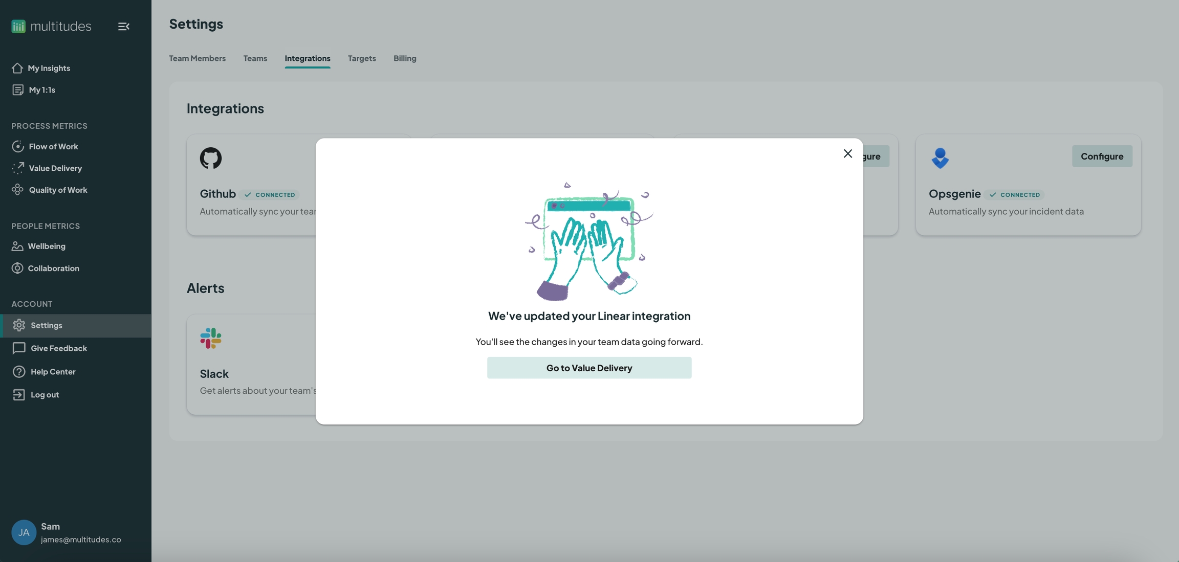 Now, you should be brought back to our app, where you’ll see a pop-up asking you to link Linear users with Multitudes users. This will determine whose Linear data we know to show in Multitudes, so it's important to complete this step. Learn more about user linking.