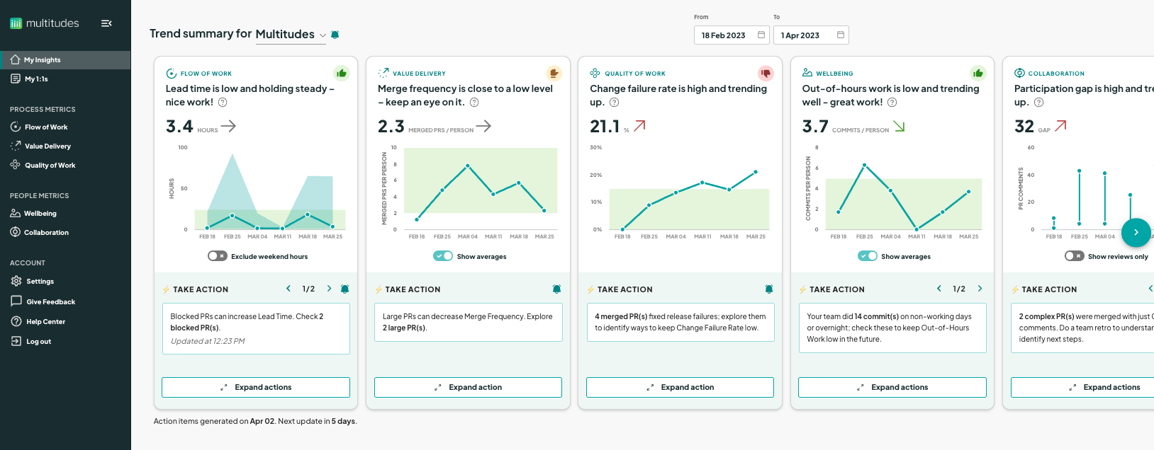 As this view is designed to be a high-level overview, the date range is fixed to the last 6 weeks. The insights and Actions are only affected by changing custom targets.