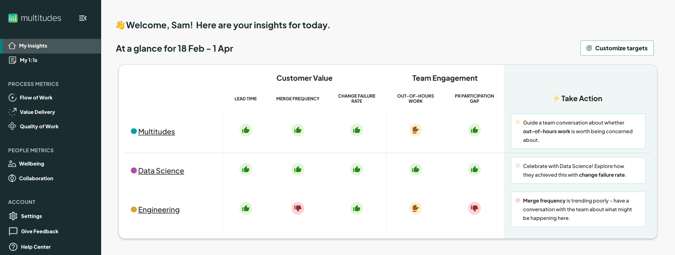 Insight trend: Whether the overall trend over the date range has been up, down, or flat over the selected date range. This is indicated by the arrow. The arrow color changes depending on whether the trend is towards the target or away from it (for example, an upward trend for Merge Frequency will be green because more merges are generally better)