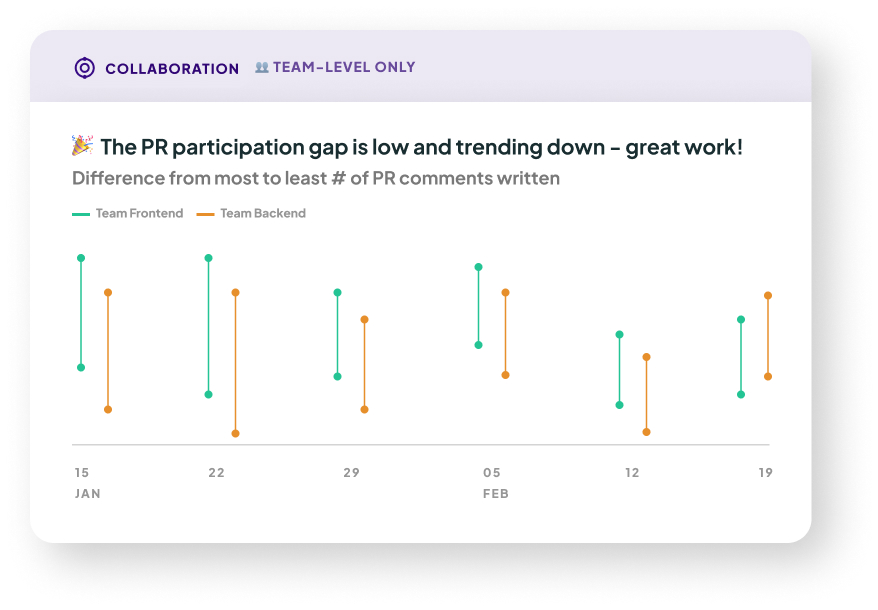 The smaller the gaps are, the better – a smaller gap means that people are contributing more equally. Looking at distributions of participation gaps each week across various teams and organizations, we found that a threshold difference of 25 comments would be a reasonably realistic goal for most teams.