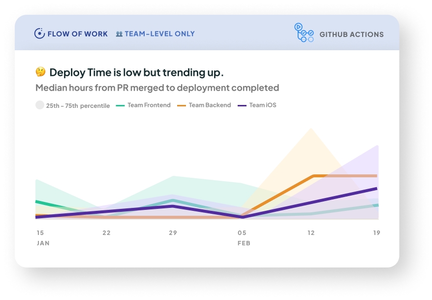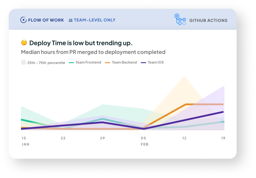 Why it matters: Deploy Time measures how fast new features, bug fixes, and hot-fixes can reach end-users. A lengthy build or deployment process can delay crucial updates, hinder customer satisfaction, and even impact the overall competitiveness of a product or service. By minimizing Deploy Time, organizations can ensure a faster time-to-market.