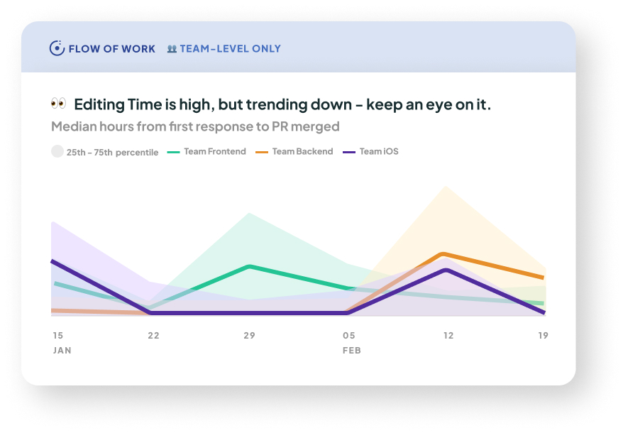 Why it matters: As a measure of back-and-forth between the code author and those who are reviewing the code, Editing Time is important for understanding bottle-necks in Change Lead Time. A high Editing Time could mean that the team needs to improve how they scope work, the received feedback is confusing, the PRs being created are large, or there are other distractions preventing fast iteration. A low Editing Time indicates that the team is able to quickly action feedback and ship work once it has been reviewed.