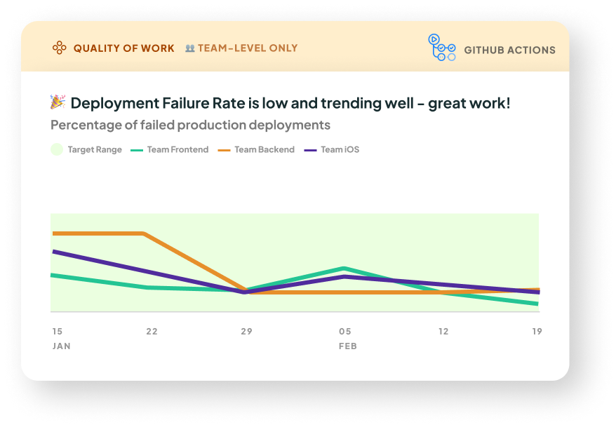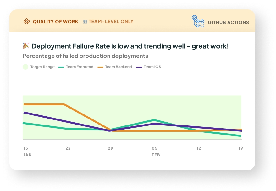 Note this currently is only available if you’re using the GitHub Actions integration. If you’re using the Deployments API, for now we only receive successful deploy attempts. In the future, we may also accept indicators of failed attempts to calculate failure rate.