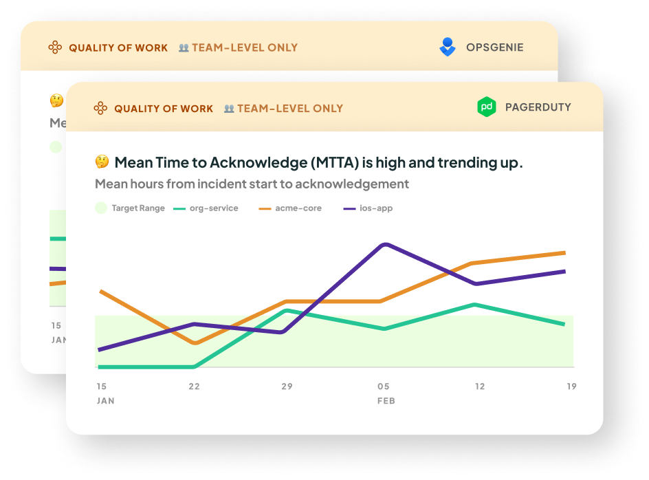 For MTTA, the times are averaged over the selected date range, for each cadence (e.g. weekly, monthly). The line chart series are grouped by Multitudes team for Opsgenie, and Service or Escalation policy for PageDuty.