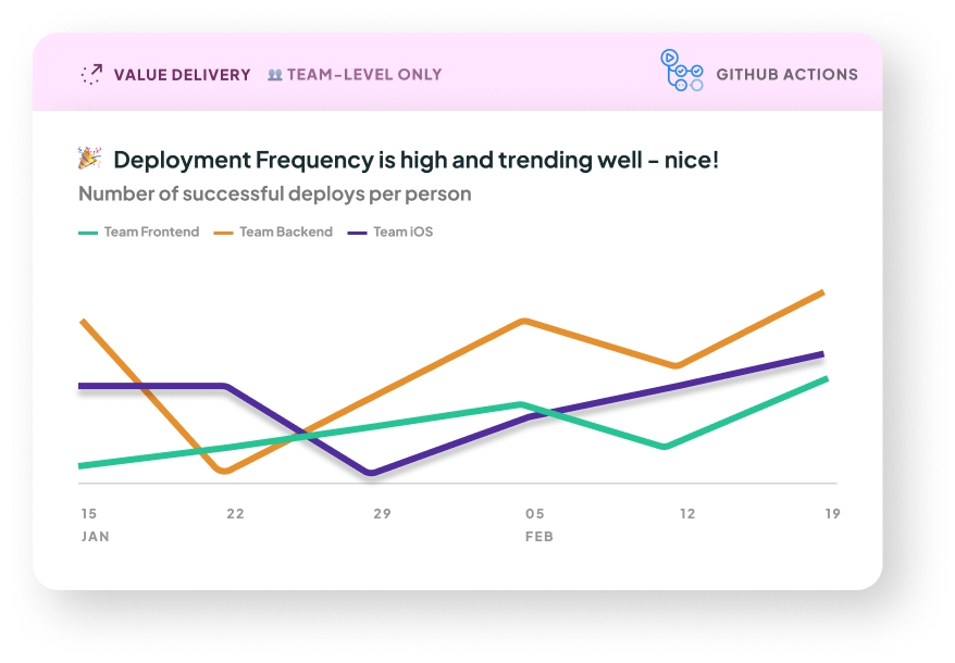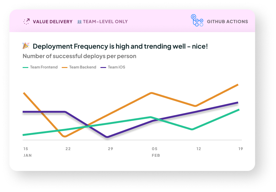 How we calculate it: We count the number of successful attempts to deploy to production in each time period, divided by the number of people on the team. This normalization is to allow benchmarking of teams against industry standards, regardless of team size.