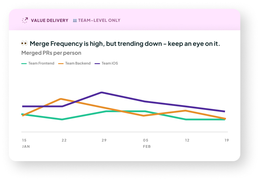 What it is: This is an alternative to DORA's Deployment Frequency. It shows the median number of PRs merged per person on a team, over time.